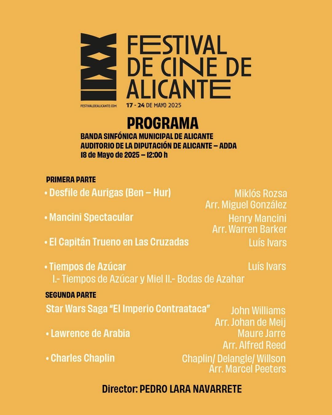 Tomorrow, Sunday, May 18th, the Alicante Municipal Symphonic Band will offer a concert of soundtracks as part of the programme of the XXII Alicante Film Festival, which will include two pieces by the Alicante composer Luis Ivars, who will receive the Music for the Image Award at the closing gala on May 25th (read more).