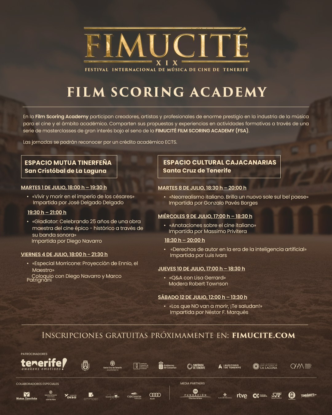 La decimonovena edición de FIMUCITÉ abre el martes 1 de julio la programación de la FIMUCITÉ Film Scoring Academy (FFSA), que se despliega cada año paralelamente a la celebración de los conciertos del Festival Internacional de Música de Cine de Tenerife, en su compromiso por la formación especializada en la creación de música para el audiovisual. Bajo la dirección académica de la profesora Débora Madrid Brito, del Departamento de Bellas Artes de la Universidad de La Laguna (ULL), está concebido como un curso de extensión universitaria, en el que se combinarán las clases magistrales expositivas con mesas redondas interactivas y talleres participativos. Más allá de abordar el fenómeno de la música para el audiovisual centrándonos en el análisis del fenómeno Gladiator, en esta edición trataremos de contextualizar el momento histórico en el que se desarrolla el film. Por supuesto, la música para el cine italiano será también protagonista de la FFSA.