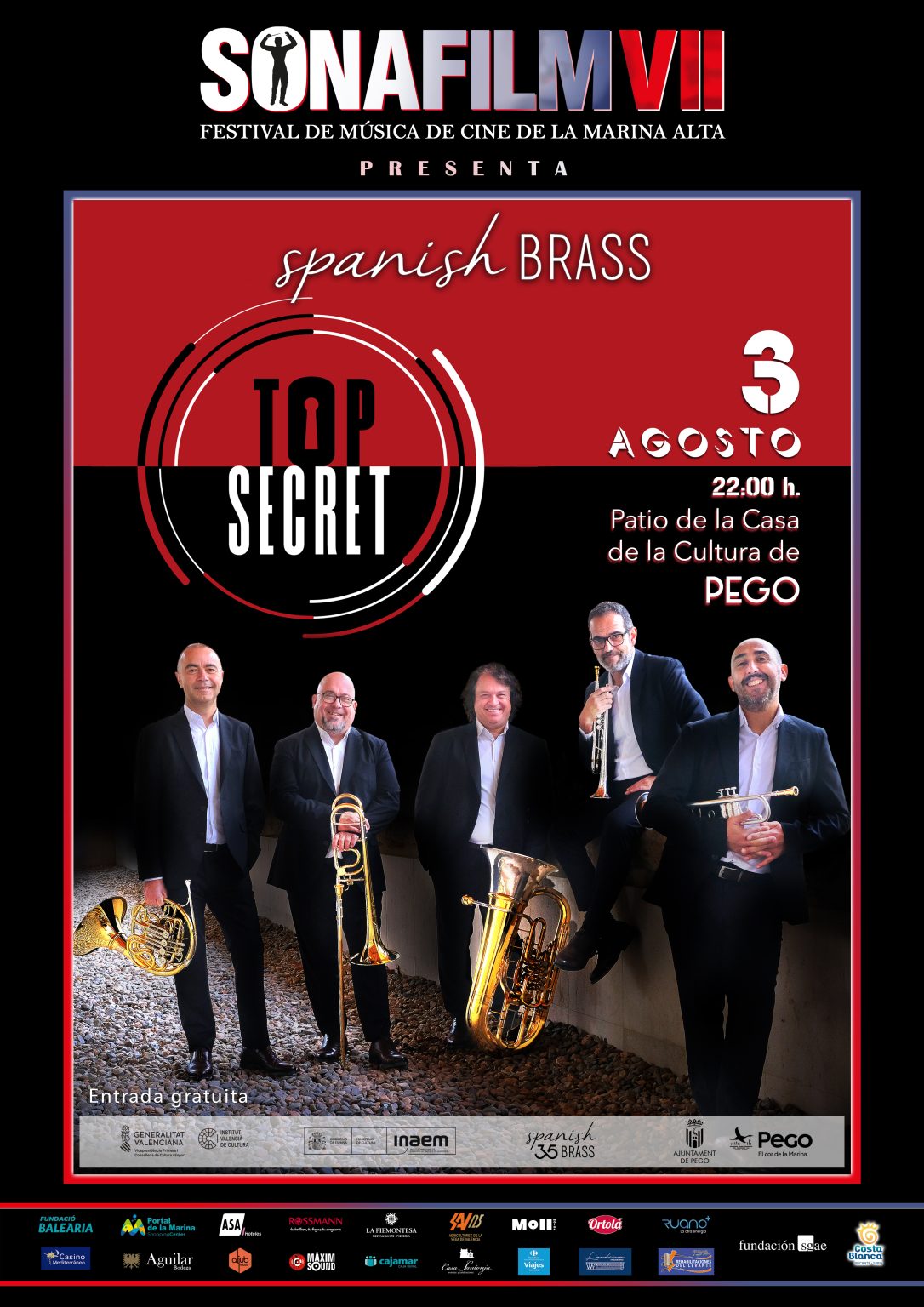 - Domingo 3 de agosto – 22:00h – Patio de la Casa de la Cultura de Pego –’Top Secret‘ – interpretado por Spanish Brass