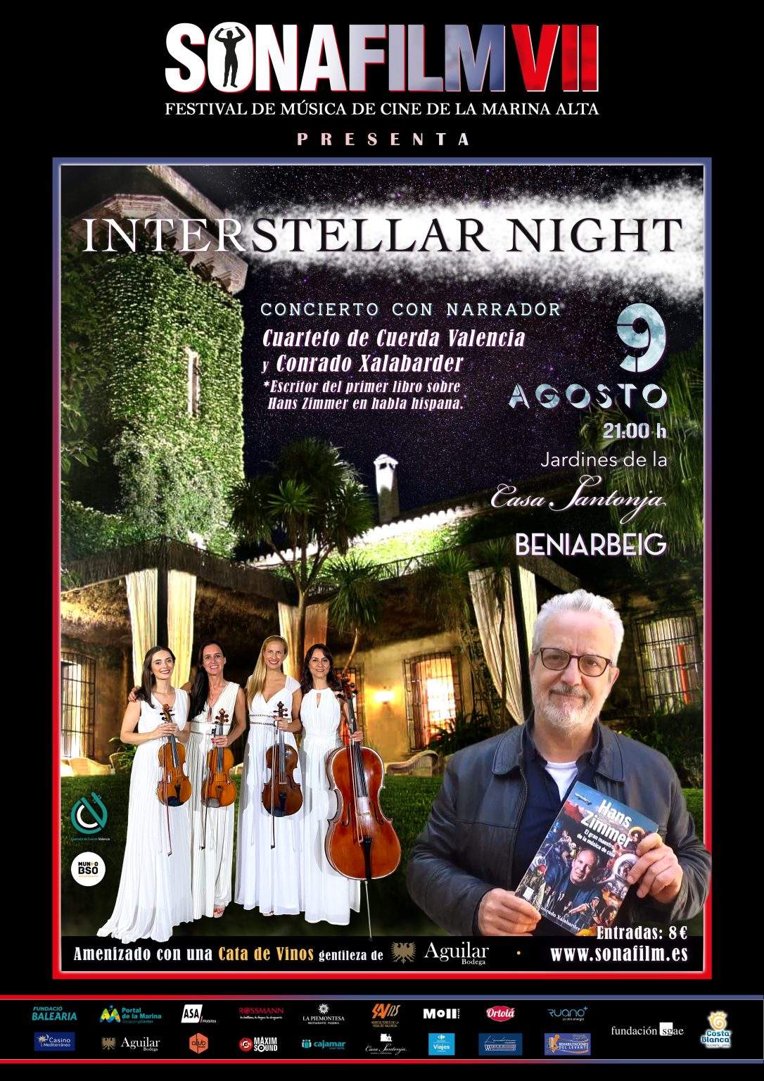 - Sábado 9 de agosto – 21:00h – Jardines de la Casa Santonja (Beniarbeig) – ‘Interstellar Night’ – Concierto con narrador, a cargo del Cuarteto de Cuerda Valencia y Conrado Xalabarder
