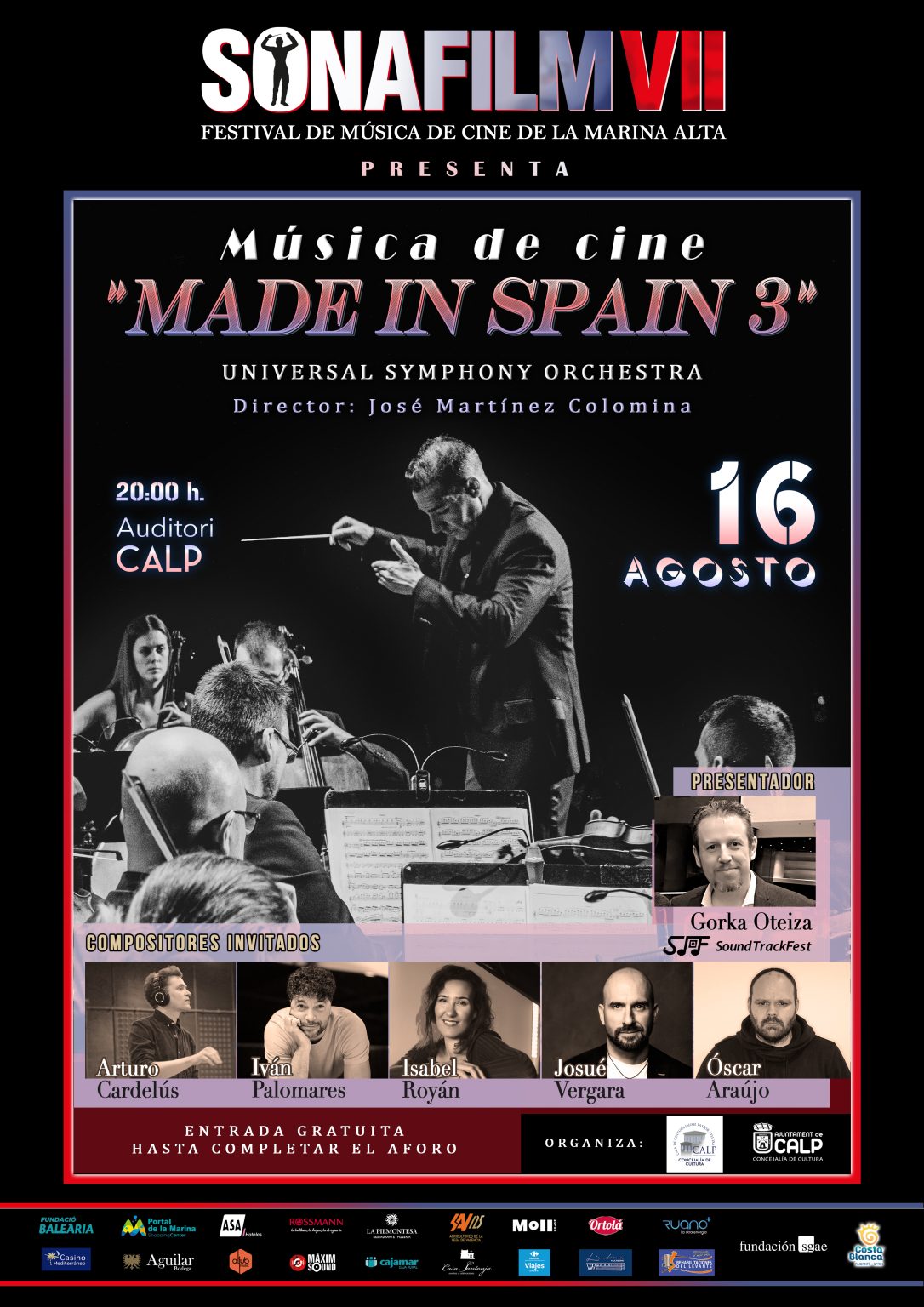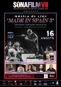 - Sábado 16 de agosto – 20:00h – Auditori de Calp – ‘Música de Cine: Made in Spain 3’ – interpretado por la Universal Symphony Orchestra, dirigida por José Martínez Colomina. En esta edición, el protagonismo recaerá en cinco de los más destacados creadores del audiovisual español actual: Arturo Cardelús, Isabel Royán, Iván Palomares, Josué Vergara y Óscar Araujo. Concierto presentado por Gorka Oteiza (SoundTrackFest),