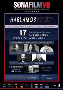 - Domingo 17 de agosto – de 11:30 a 13:30h – Sala Multiespai l’Androna de Baleària – Dénia – ‘Hablamos de Música de Cine’ – Masterclass con compositores invitados: Arturo Cardelús, Isabel Royán, Iván Palomares, Josué Vergara y Óscar Araujo, moderada por Gorka Oteiza (SoundTrackFest).
