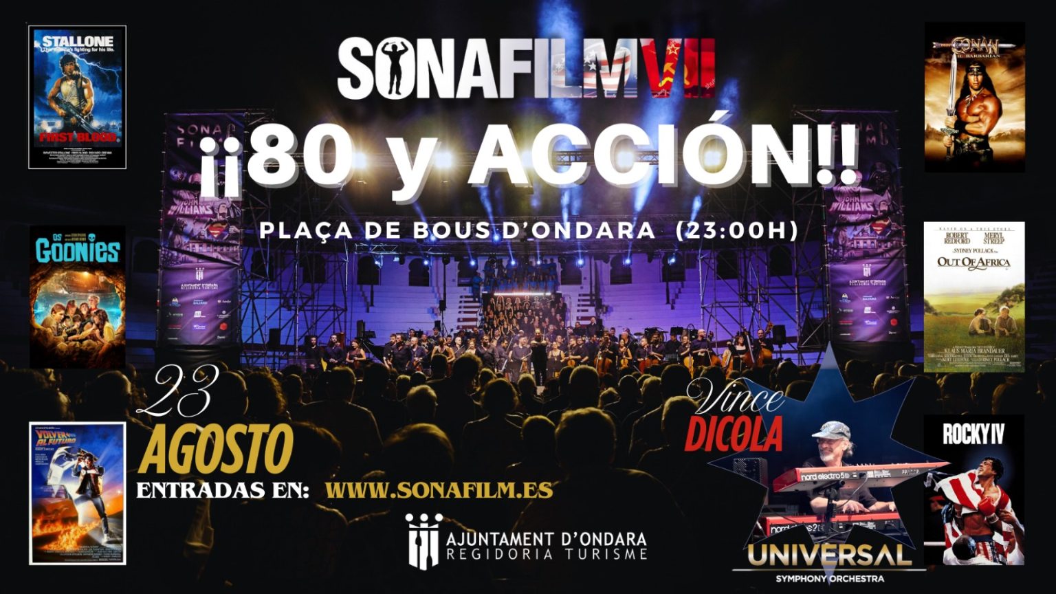 El cine de los 80 será la temática principal de esta edición, y para ello contará con un invitado de excepción como Vince DiCola, compositor de “Rocky IV” (1985) y “Transformers: The Movie” (1986), entre otras películas. El concierto principal en Ondara, titulado “80 y ¡Acción!” y a cargo de la Universal Symphony Orchestra, la orquesta residente de SONAFILM, tendrá lugar el 23 de agosto a las 20:00 horas en la Plaza de Toros de Ondara, con un repertorio que incluirá música de clásicos como “Regreso al futuro”, “Rambo”, “Conan el Bárbaro”, “Depredador” o “Memorias de África”.