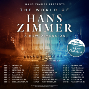 Hoy, 5 de septiembre de 2025, se celebra el primer concierto de “The World of Hans Zimmer – A New Dimension” en Sunrise, Florida, EE. UU., dando inicio a una gira que recorrerá 24 ciudades de EE. UU. y Canadá, y que finalizará el 11 de octubre en Vancouver, Columbia Británica, Canadá.