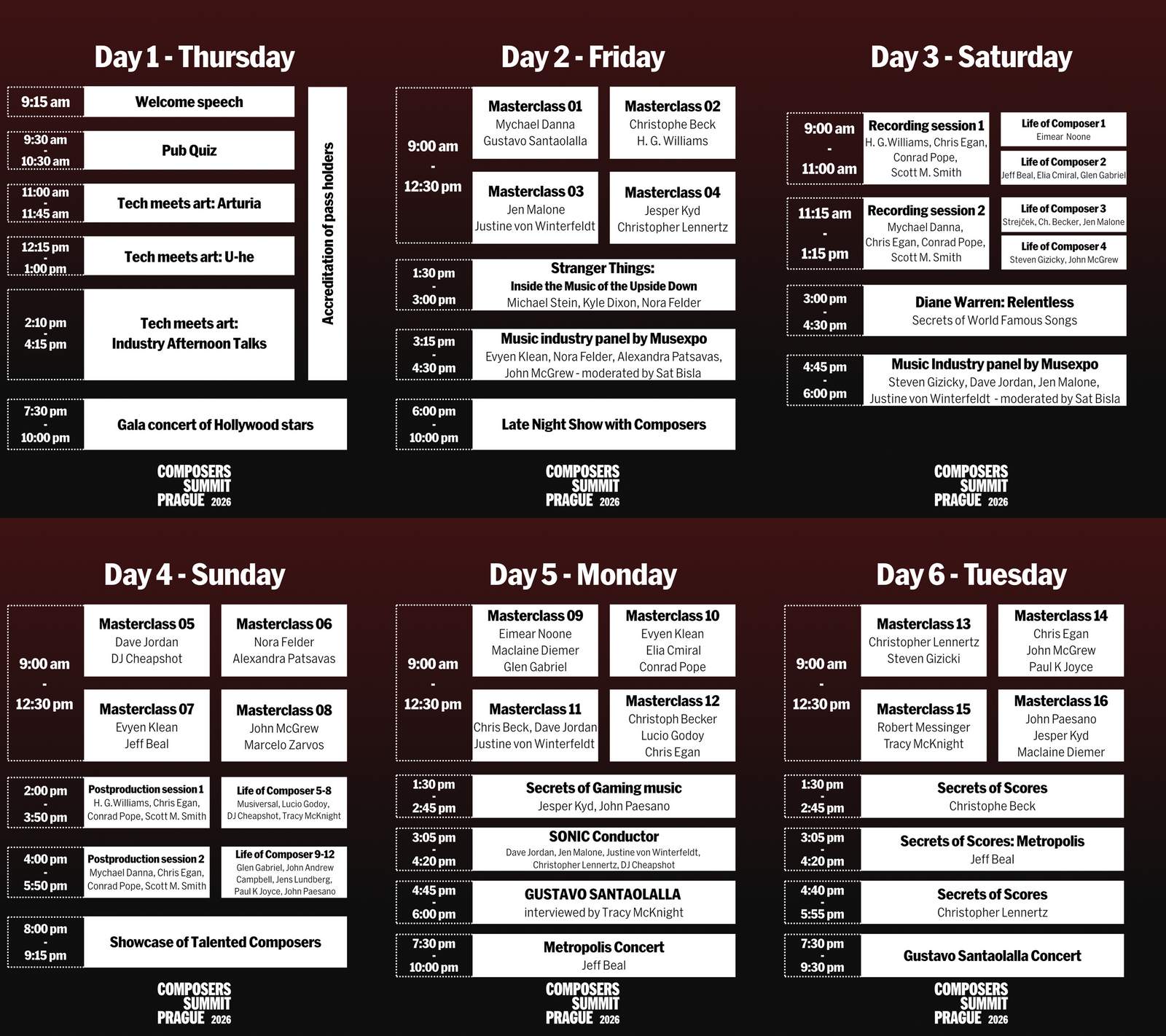 It is the centerpiece of the Composers Summit Prague 2026 and a must-attend event for anyone passionate about the art of film scoring. This session offers an extraordinary opportunity to dive into the minds of world-renowned Hollywood composers as they unveil the magic behind their most celebrated works. A series of captivating presentations where top industry composers unfold their creative process, share insider tips and tricks, and reveal the behind-the-scenes moments that brought their iconic scores to life.